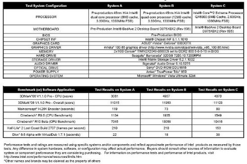 Histoire d’enfoncer le clou Intel communique donc aujourd’hui les résultats des premiers tests réalisés sur des exemplaire de pré-production du Penryn. Le "must" de ce qui se fait actuellement en processeur, L’intel Core 2 Extreme QX6800, est donc opposé à un Penryn Dual Core pourvu de 6 Mo de cache et à un Penryn Quad Core assez logiquement pourvu de 12 Mo de cache L2.