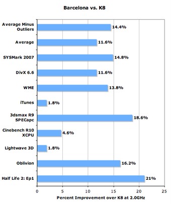 D’après leur dossier, à fréquences égales, le nouvel AMD Opteron Barcelona se montre environ 10 à 20% plus puissant que l’ancien AMD Opteron basé sur l’architecture K8. Cet écart significatif peut être remarqué sur quaisment toutes les applications sauf iTunes, CineBench et LightWave 3D. (voir ci-dessous). Ce test laisse augurer les l’écarts de performances que l’on retrouvera entre les processeurs AMD athlon 64 et les futurs AMD Phenom destinés au grand public qui devraient voir le jour à la fin de l’année.