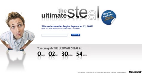 Dans un premier temps réservée aux étudiants américains, canadiens et britaniques, cette offre devrait débuter dans quelques heures à peine. Microsoft a déjà mis en place un site internet baptisé theultimatesteal.com pour accueillir ses futurs clients avec un compte à rebours indiquant le temps restant avant le début de cette offre.