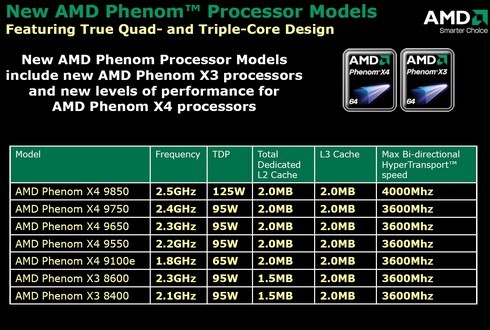 Dans le premier d’entre eux, le fondeur annonce le lancement d’une nouvelle version de ses Phenom 9000 dont les tarifs ont été revus à la baisse. En stepping B3, ces processeurs corrigent un bug affectant le TLB (Translation lookaside buffer) des révisions B2 qui, lorsqu’il était contourné, faisait chuter assez considérablement les performances du processeur. Ces processeurs revus et corrigés utilisent les mêmes fréquences que les versions précédentes mais ont été baptisés "Phenom 9x50" au lieu de "Phenom 9x00", afin d’éviter toute confusion chez les consommateurs.