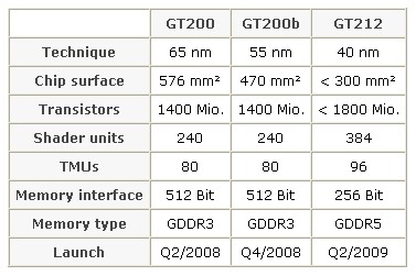 En effet, après les photos, les spécifications et le test de la GeForce GTX 295, c’est aujourd’hui la génération suivante qui livre ses caractéristiques. En effet, avant que le GT200b ne soit présenté officielement, le site allemand hardware-infos livre, selon des sources proche de NVIDIA, les caractéritiques du futur GPU haut de gamme de la marque au caméléon à savoir le GT212.