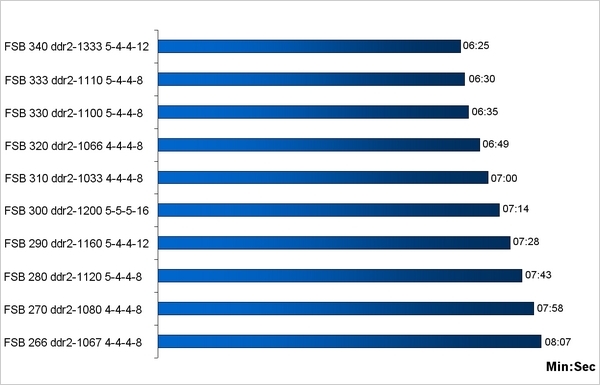 Là encore, l’évolution du graphique est très linéaire et montre donc que le gain de performance relevé est en priorité lié à l’overclocking du FSB. Cette impression est d’ailleurs confirmée par les résultats obtenus avec le FSB paramétré à 266 MHz et la mémoire cadencée à 1067 MHz . A cette fréquence, la compression est réalisée en 8mn 7s avec des timing en 4-4-4-8 et 8mn 8s avec des timings en 5-5-5-16 (voir page précédente).