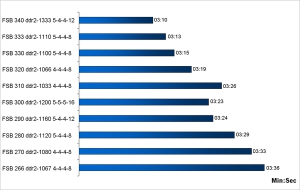 Evidemment, comme tous les logiciels, Winrar apprécie tout particulièrement notre overclocking qui lui fait gagner 13 secondes lors de la compression mais contrairement à d’autres, la fréquence de la mémoire à un impact certain sur les performances de celui-ci. En effet, sur le graphique ci-dessus Winrar se montre plus rapide avec un FSB cadencé à 300 MHz et la mémoire cadencée à 1200 MHz en 5-5-5-16 qu’avec un FSB à 310 MHz et la mémoire cadencée à 1033 MHz en 4-4-4-8.