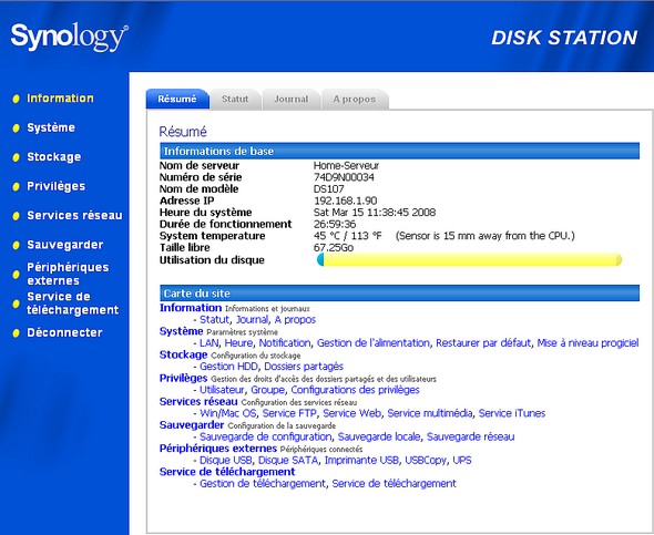 Si vous n’avez pas défini de mot passe d’administration lors de l’installation du NAS, il suffit d’appuyer sur le bouton entrée. Le NAS ouvre alors une page d’informations et vous indique toutes sortes d’informations telles que le nom du serveur sur le réseau, son addresse ip, la température du CPU ou encore la capacité restante sur le disque dur.Â