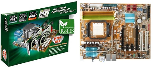 Avec le joli nom de KN9 SLI, elle arbore le chipset NVIDIA nForce 570 SLI MCP (dissimulé sous un radiateur) et permet donc l’utilisation de deux cartes graphiques en PCI-Express 16x montées en SLI.
