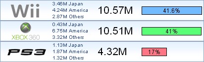 Le très sérieux site vgchartz a publié aujourd’hui les chiffres des ventes des 3 "grandes" consoles du marché. Les chiffres de ce site n’ont pas été confirmé officiellement mais ils ont l’air des plus concrets.