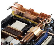 ASUS a par ailleurs, soigné le refroidissement des composants en utilisant sa nouvelle technologie "ASUS Cool Mempipe", technologie qui permet de dissiper la chaleur émise par la mémoire vive via des heatspreaders en cuivre reliés à des heatpipes connectés aux principaux éléments de refroidissement de la carte mère.