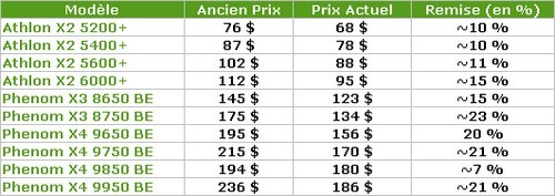 De son coté, AMD compte bien rattraper le retard accumulé en ofrant une baisse de prix sur les modèles les plus répandus (en moyenne 15%). Les Quad Cores de chez AMD pourraient donc devenir plus interressants pour les applications lourdes, telles que le montage vidéo ou autres. Voici un tableau récapitulant les modèles concernés :