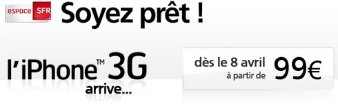 Aujourd’hui, c’est chose faite puisque SFR vient de donner ses premières conditions. L’Iphone 3G sera donc disponible dans toutes les boutiques SFR, et sur son site internet à partir du 8 avril 2009. Les 2 versions seront proposées : 8 Go et 16 Go... Les tarifs seront de 99 € et 199 € pour une durée d’engagement que l’on peut supposer être de 24 mois même si l’opérateur ne l’a pas précisé. L’opérateur qui a donné très peu d’informations présente l’offre ainsi (voir ci-dessous).