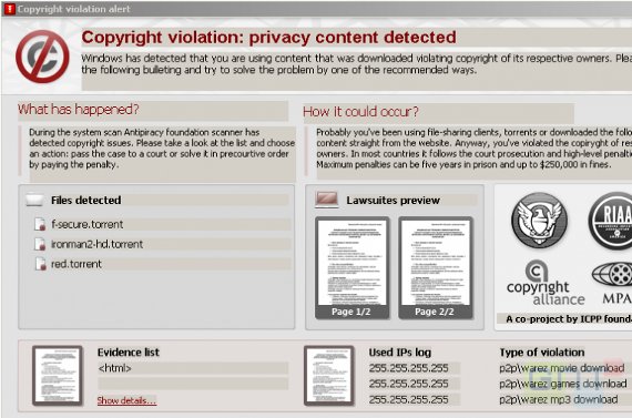 Ce nouveau malware s’installe donc sur le disque dur, à la recherche de fichiers .torrent, symptômes que l’utilisateur utilise ce réseau P2P. Si il en trouve, il afficher une fenêtre, indiquant qu’une pratique illégale, et invite l’utilisateur à payer la modeste somme de 400$ par carte de crédit via un site contrefait. La ou l’illusion est bonne, c’est que le logiciel se vante d’être affilié à l’ICPP Foundation, organisme en lien avec la RIAA et la MPAA, eux même puissants acteurs sur la scène du lobbyisme du disque américain. Cependant, l’ICPP est un organisme nullement affilié aux deux cités.