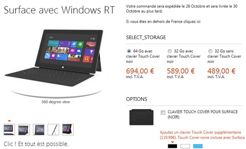 Tarif Microsoft Surface avec Windows RT en 64 et 32 Go avec ou sans clavier