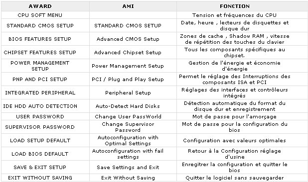Ce menu vous permet de règler / asctiver / désactiver l'ensemble des fonctions de votre carte mère. Il existe principalement deux types de bios dont les fonctions diffèrent légèrement: Award et Ami. Pour éviter toute confusion, vous trouverez ci-dessous un tableau récapitulant la page d'accueil de chacun des ces bios.