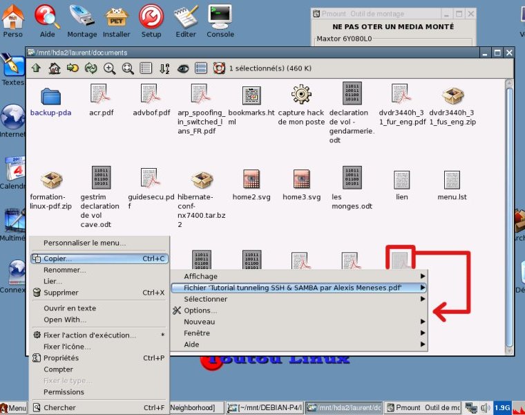 Premiers pas... Les choses sérieuses commencent, mais vous allez découvrir que ça reste d’une simplicité... Linuxienne :-) Commençons par parcourir le disque sur lequel vous voulez récupérer vos données ; pour cela vous avez un outil qui fait tout sur le bureau et qui se nomme PMOUNT dans le menu. L’appellation peut changer mais généralement il est représenté en haut par une clef USB. Cliquez dessus pour ouvrir la fenêtre de contrôle des périphériques de stockage : La fenêtre des périphériques s’ouvre, dévoilant les disques (partitions), périphériques USB, ou lecteur/graveurs de CD/DVD détectés. Sous Linux pour utiliser un disque il faut d’abord le « monter ». Ne nous étendons pas sur le pourquoi de cette opération, sachez seulement qu’après avoir monté un disque on peut (schématiquement) y lire ou écrire des données, et qu’à la fin de son utilisation il faut le « démonter » pour une sécurité maximale de l’intégrité des données. Sur l’exemple, nous montons la partition 2 du disque Maxtor IDE (hda2) qui contient des données. On notera que ce disque affiche un format EXT3 (courant sous Linux). Pour une récupération d’un disque XP, le format pourrait être NTFS ou FAT32 par exemple, et la partition disque s’appellerait HDA1 ou SDA1 (disque SATA) correspondant généralement au C:. De toutes les manières et dans le doute, vous pouvez monter et ouvrir toutes vos partitions dans le cadre du disque dur pour y retrouver vos données, nous ne faisons que les lire... L’opération de montage ouvre automatiquement le contenu de la partition dans une fenêtre (affichée dessous sur l’exemple). C’est un explorateur de fichier, simple ou même simpliste au premier coup d’oeil, mais qui comporte un liste d’options et d’opération conséquente. A noter qu’un seul clic gauche suffit pour ouvrir un fichier ou un répertoire... pas de double-clic habituel donc. Sur l’exemple, nous parcourons et ouvrons le dossier « Documents » en cliquant simplement sur l’icône du dossier. En faisant un clic droit de souris sur un document, on constate que l’on peut à loisir faire plusieurs opérations, voir les propriétés, exploiter le fichier, le sélectionner, supprimer, copier, etc... Le fonctionnement reste identique à ce qu’on peut connaître dans un explorateur Windows par exemple. Une sélection à la souris d’une « fenêtre » d’objets est possible, et surtout les touches CTRL et SHIFT vous permettent de sélectionner/désélectionner facilement les éléments que vous voulez prendre. Nous avons trouvé nos fichiers, nous décidons donc les sauver en les gravant sur un CD-RW. Passons à l’étape suivante....
