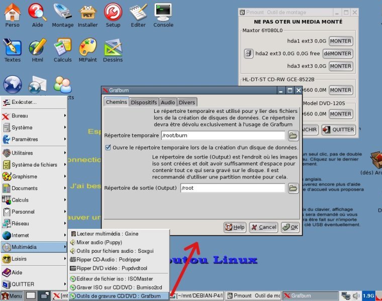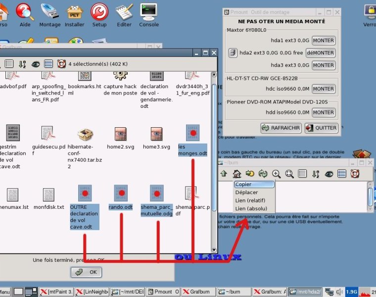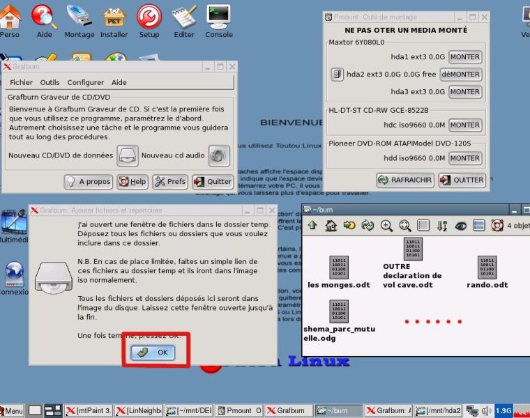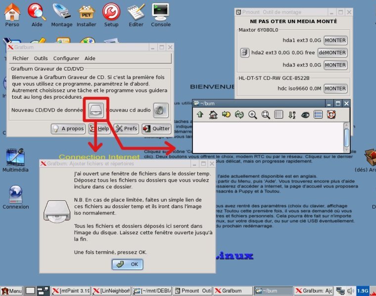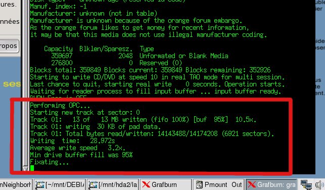 Gravure des données Réduisons provisoirement la fenêtre de notre dossier Documents dans la barre des taches, puis nous lançons l’outil adéquat qui va nous permettre de graver : L’application en question se nomme GRAFBURN et se trouve dans le menu Multimédia. En le lançant une première fois, on se retrouve devant un mini-dialogue de paramétrage à renseigner. A moins de vouloir changer quelques options de base comme le nom de l’image ISO par défaut, ou enlever la gravure en multi-session par défaut, on peut valider et passer à la suite par OK. On se retrouve ensuite sur le programme GRAFBURN. Ce qui nous intéresse est de graver des données, on clique donc sur le bouton « nouveau CD/DVD de données ». S’ouvrent alors deux fenêtre : une qui vous explique clairement la marche à suivre : copier/coller des fichiers à graver dans l’autre fenêtre AVANT de valider par OK l’autre : la fenêtre devant accueillir toutes les données à graver. Cette fenêtre est en fait un dossier temporaire (noté ~/burn) qui servira au programme pour constituer une image ISO de la sauvegarde La méthode est donc assez simple : nous allons copier/coller nos données à sauvegarder dans la fenêtre vide.