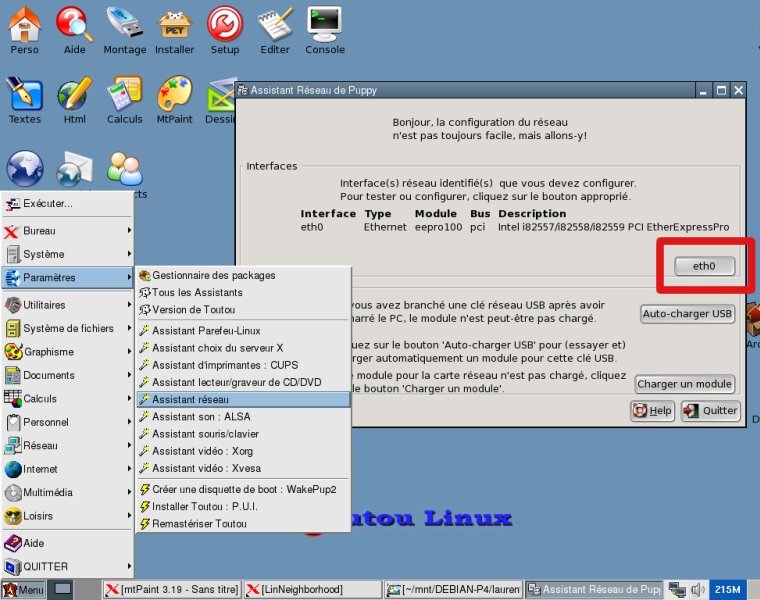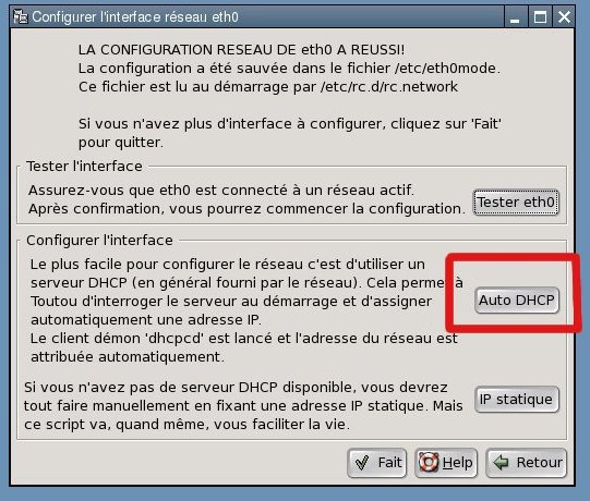 Pas de graveur, pas d’USB, mais du réseau : on peut faire quelque chose avec ça ? Aussi, oui... même si beaucoup de choses sont faisables et configurables, nous allons prendre un exemple simple : un autre PC est disponible sur le réseau, avec à minima un répertoire partagé un serveur DHCP est activé (comme sur une box par défaut, freebox, livebox...) pour obtenir simplement et automatiquement une configuration réseau Commençons par le réseau : lancez l’outil de configuration situé dans le menu PARAMETRAGE et nommé « assistant réseau » Une fenêtre s’ouvre présentant la carte réseau en première partie. Cliquez sur le bouton de l’interface (généralement toujours ETH0) pour aller la configurer. Comme nous disposons d’un serveur DHCP sur le réseau, il suffit de cliquer sur le bouton AUTO DHCP pour récupérer des paramètres réseau automatiquement. A ce stade, la configuration est réussie.Validez et fermez la fenêtre et le programme de configuration réseau. Nous pouvons passer au parcours et à la recherche des PC sur le réseau. Pour cela lançons un petit, mais néanmoins puissant, outil avec un drôle de nom (imprononçable et dur à écrire) : « LinNeighborhood ». Vous le trouvez dans le menu RESEAU en tant que client samba. Une fois lancé, la première chose à faire est de se mettre sur le groupe de travail du réseau. Pour cela cliquez sur le bouton de préférences.