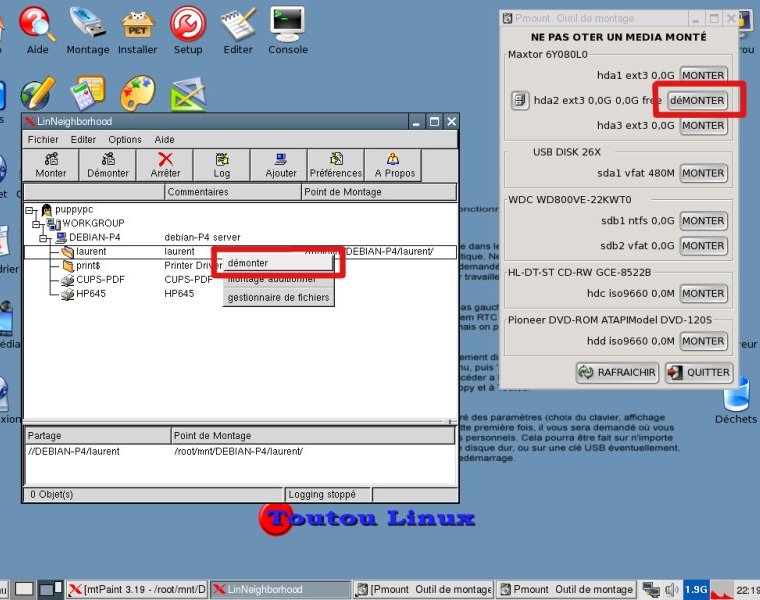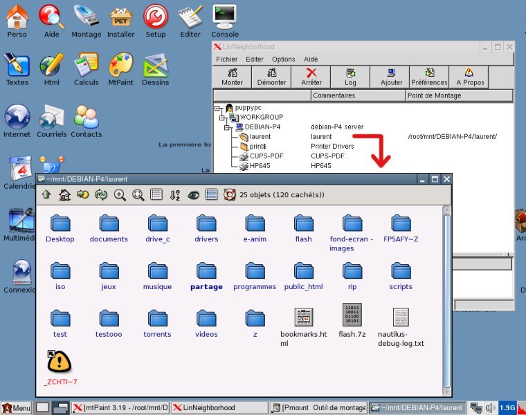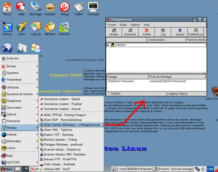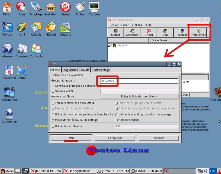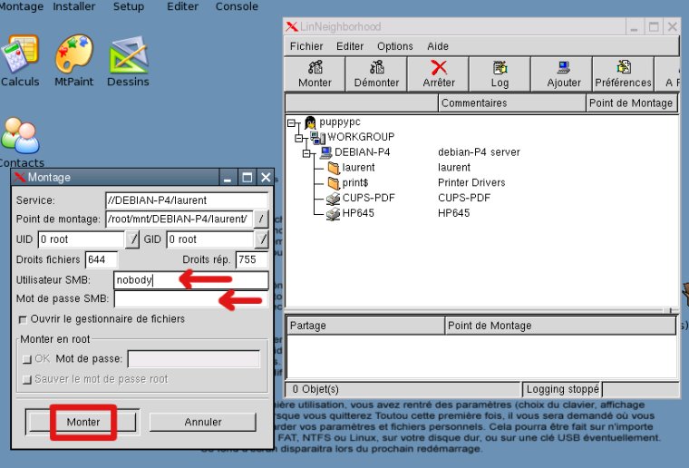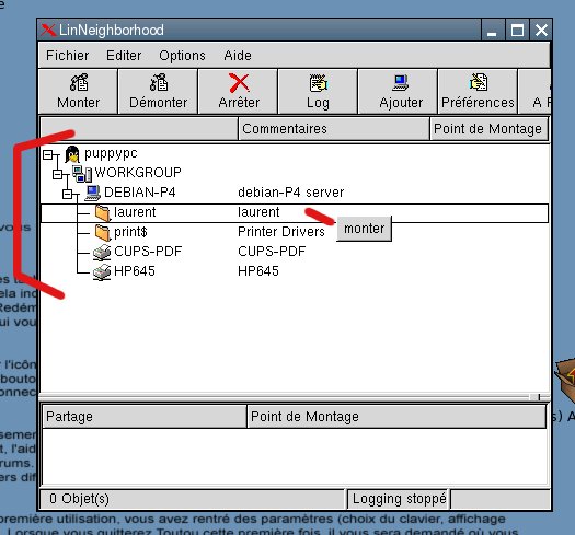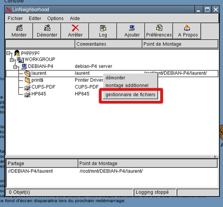Entrez le groupe de travail. Comme nous sommes restés classique, nous avons mis « workgroup » pour notre réseau. S’il en est de même pour vous, renseignez la zone et cliquez sur « enregistrer » puis « fermer ». En cliquant sur le [+] de la ligne puppypc nous déroulons notre réseau et les PC s’y trouvant. Sur l’exemple nous constatons un autre PC nommé « DEBIAN-P4 » avec des ressources partagées et notamment un espace nommé « laurent ». Comme pour les disques et autres périphériques, Linux a besoin de monter la ressource pour qu’elle soit accessible. Un clic droit sur la ligne, puis un clic gauche sur « MONTER » permet de faire cela.