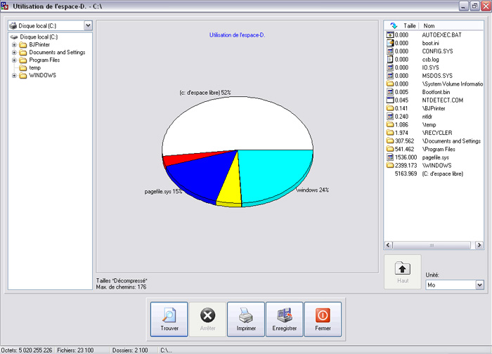 Easy Cleaner met à notre disposition un petit outil simple mais redoutablement efficace. A l'écran principal, choisissez Espace-D.D. Sélectionnez simplement le dossier dont vous voulez voir la composition sous forme de diagramme et cliquez sur Trouver.