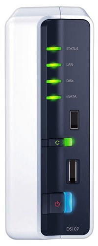 La façade comporte quatre diodes qui permettent de savoir en clin d’oeil l’état des différents services intégrés au NAS (Statut, Lan, Disk et eSata). Elle est aussi pourvue de 2 boutons accompagnés de DEL (Diode électroluminescente). Le premier permet de mettre en service l’appareil alors que le second permet de sauvegarder les données d’un périphérique qui serait branché en USB sur le NAS.