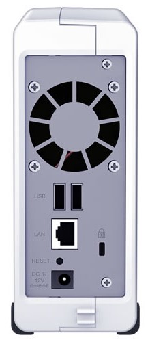 L’arrière du boîtier comporte un connecteur RJ45 (100Mb) permettant de raccorder le NAS à votre modem/routeur ou votre BOX. On remarque aussi la présence d’un bouton reset, de deux ports USB supplémentaires pour, par exemple, raccorder une imprimante que vous souhaiteriez partager via le réseau (wifi ou RJ45) avec les autres ordinateurs présents chez vous.