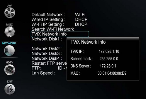 Le port réseau intégré et/ou la connexion wifi (clé wifi en option) permettent l’utilisation du disque dur TViX en réseau. La configuration du TVIX sur le réseau s’avère particulièrement simple d’autant que ce dernier supporte le DHCP. Vous pouvez aussi donner une adresse ip fixe au jukebox si vous le souhaitez.