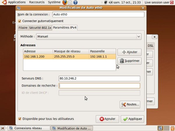 1) - Il nous faut fixer la configuration réseau de notre PC passerelle. En effet, il faut lui attribuer une adresse IP fixe pour pouvoir s’en servir. Nous choisissons arbitrairement et impérativement une adresse différente des autres PC du travail et de la LiveBox. Si votre réseau d’entreprise possède un serveur DHCP (une machine ou un routeur délivrant des adresses IP automatiquement) l’adresse de la passerelle doit également éviter d’être dans la plage DHCP. Généralement, ces plages sont attribuées de 192.168.1.1 à 192.168.1.50 par exemple.