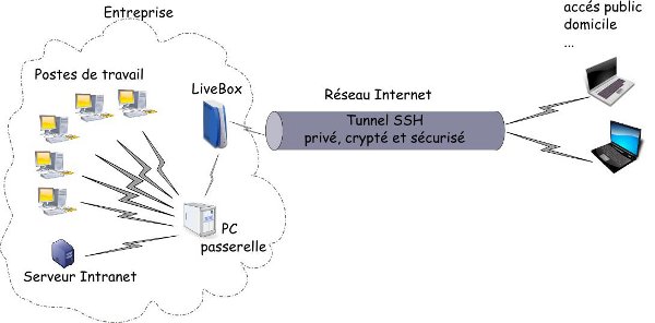 - le PC fait office de passerelle et de serveur SSH, un protocole sécurisé permettant les connexions et les transferts chiffrés de données