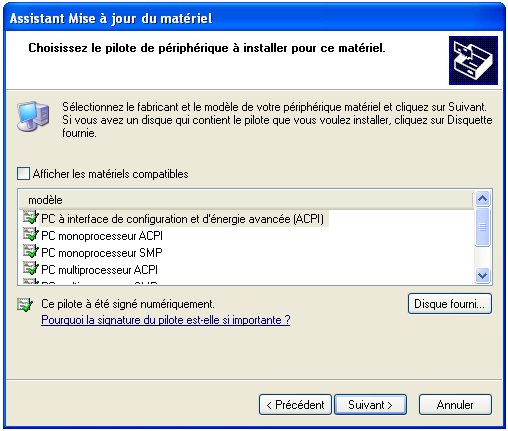 - Décochez la case, "affichez les matériels compatibles" puis choisissez "PC à interface de configuration et d'énergie avancée (ACPI)"  puis cliquez sur suivant.