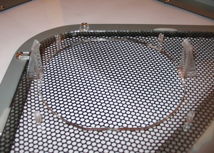 - Le second ventilateur est intégré dans le panneau latéral du boitier. Une griffe de fixation intégrée à la vitre en plexiglas est là pour le maintenir (voir photo ci-dessous).