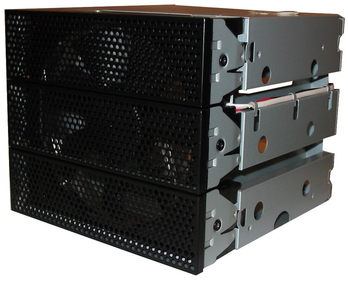 Le ventilateur est intégré au rack et le démontage du rack s’avère on ne peut plus simple. Il suffit d’enlever les 8 vis qui le maintiennent au boîtier (sans tournevis) et de le pousser vers l’extérieur du boîtier. Chacun de ces racks comporte 3 emplacements 3,5 pouces.