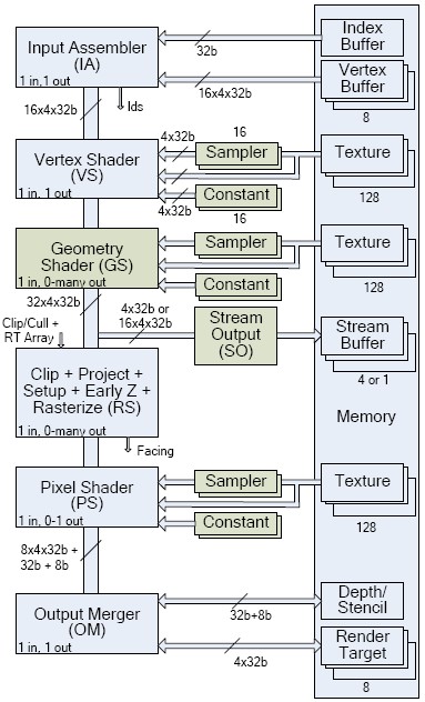 Si l’on observe rapidement le schéma ci-dessus, on constate en un coup d’oeil que les geometry shaders (Nuanciers de géométrie) constituent la principale nouveauté apportée à ce pipeline et donc aux Shaders Model 4.0.  Alors que les Vertex Shader servent à manipuler la géométrie crée par le CPU pour la déformer, les Geometry Shaders se servent des primitives (points, lignes ou triangles) pour en créer d’autres. En agissant sur les données fournies par les Vertex Shaders (situé juste avant dans le pipeline: voir schéma ci-dessus) les Geométry Shaders peuvent ajouter infiniment des polygones à une forme géométrique afin de la rendre plus réaliste.