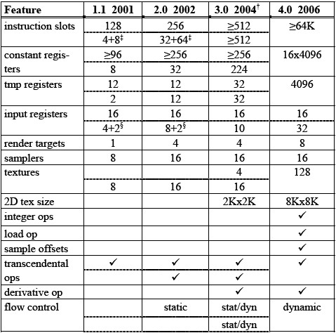 Chaque évolution de DirectX arrive avec une évolution du Shader Model qui pour rappel vient de passer en version 4.0. Cette nouvelle version n’a pas engendrer que des modifications du pipeline. Dans le tableau ci-dessous qui représente les différentes évolutions du Shader Model, on constate que Microsoft en a profité pour revoir à la hausse certaines valeurs comme le nombre d’instruction, le nombre de registre temporaires (...) afin d’éviter de limiter les développeurs. Par exemple, on peut citer le nombre d’instructions qui passe à 65536 au lieu de 512 ou encore les registres temporaires qui passent 4096 au lieu de 32.