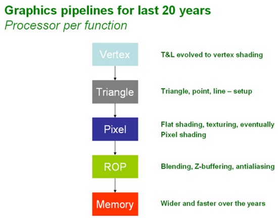 Les pipelines des GPU, même si ils ont été améliorés durant ces 20 dernières années ont toujours fonctionné en traitant les données de manière linéaire sans pouvoir contourner une étape qui ne serait pas nécessaire. Par exemple, ce type d’architecture ne permettait pas de mettre en mémoire les données juste après leur passage dans les unités de traitement des Vertex Shaders pour pouvoir les traiter en plusieurs passes.