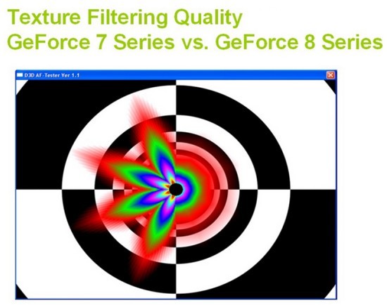 Comme nous l’avons vu plus haut en étudiant la structure des anciens pipelines, le ROP gère aussi un certain nombre d’effet de filtrage comme le Z-buffering, l’antialiasing etc...  Le G80 apporte aussi de nombreuses améliorations à ces modes de filtrage. NVIDIA en a d’ailleurs profité pour les regrouper sous une nouvelle appellation : le moteur Lumenex. Sans rentrer dans le détail, on trouve ainsi un nouveau type de filtrage appelé coverage sample anti aliasing (CSAA) qui améliore la précision de l’antialiasing avec les modes (8x, 8xQ, 16x, 16xQ), l’anti-crénelage est dorénavant utilisable en même temps que les effets de rendu HDR et enfin le filtrage anisotropique a considérablement été amélioré (Voir ci-dessous).Â
