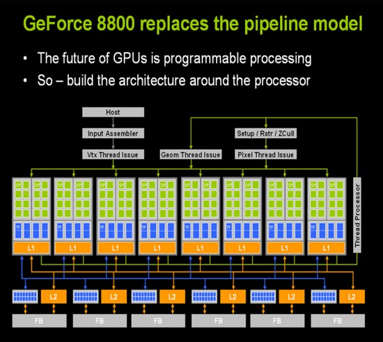 Avec l’architecture unifiée voulue par Microsoft et DirectX 10, la donne a considérablement changée. NVIDIA a donc intégré dans son G80 une multitude de petites unités de traitements polyvalentes capables de réaliser des opérations de Vertex Shading, de Pixel Shading, Geometry Shading etc... Au lieu d’être dédiées à une tâche spécifique, ces unités de traitement que l’on appelle ici des Streaming Processors sont programmables et se font attribuer dynamiquement leurs tâches en fonction du besoin de l’application 3D.Â