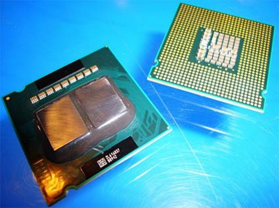 Les 2 principaux fondeurs AMD et Intel ont laissé tomber la course aux mégahertz pour la course au nombre de coeur qui sur un plan performance s’avère nettement plus profitable. Les processeurs Intel Core 2 Duo que nous connaissons comme le modèle employé dans ce test (E6400) comptent deux coeurs dans la même puce et c’est le cas de tous les processeurs digne de ce nom commercialisés aujourd’hui. Le processeur Core 2 Extreme QX6700 va encore plus loin puisqu’il intègre dans une seule puce deux die de processeur Core 2 Duo l’un à côté de l’autre soit un total de 4 coeurs (Voir photo ci-dessous).